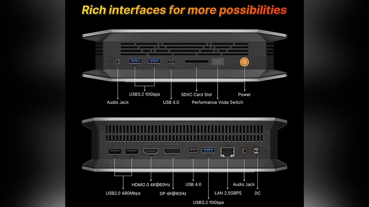 Новинка оснащена 16-ядерным APU Ryzen AI MAX+ 395 из линейки AMD Strix Halo. Этот процессор сочетает архитектуру Zen5 и продвинутую встроенную графику, что делает систему пригодной не только для работы с LLM, но и для визуальных задач и даже игр в высоком качестве. Объём оперативной памяти составляет 96 ГБ LPDDR5X-8000 — показатель, встречающийся редко даже в топовых мини-PC. Для хранения данных предусмотрены два слота M.2 2280 PCIe 4.0 x4, один из которых уже занят SSD на 2 ТБ.