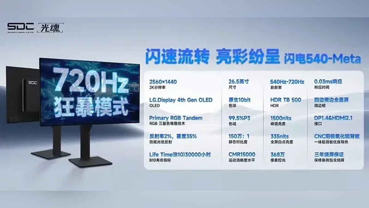 Ключевая функция — «режим разгона»: при снижении разрешения до HD (1280 × 720) частота достигает 720 Гц. Хотя такое разрешение редко используется даже в киберспорте, технология демонстрирует запас производительности контроллера панели. Новая панель обладает яркость до 1500 нит (пиковая) для HDR-контента и имеет цветовой охват 99.5% DCI-P3.