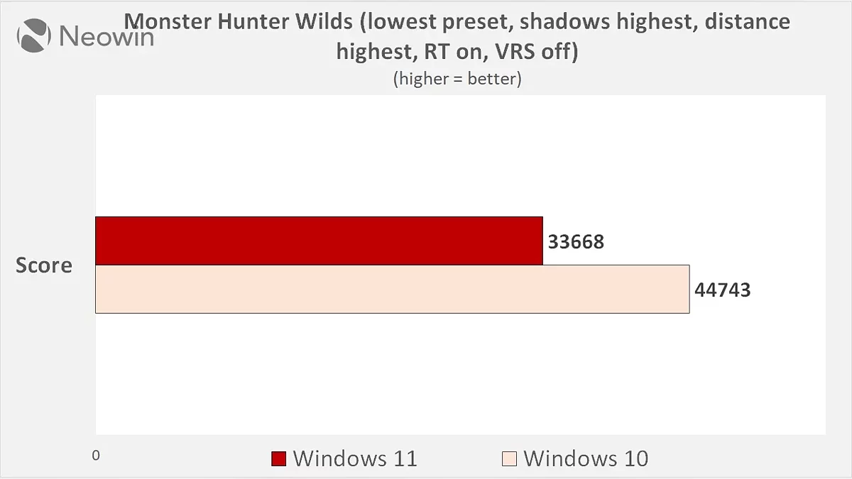 Картина радикально изменилась в реальных играх при настройках, минимизирующих нагрузку на GPU. По показателям среднего FPS Assassin's Creed Odyssey в Windows 11 оказалась быстрее на 55%, Cyberpunk 2077 на 17-19%, схожий паритет продемонстрировала и Far Cry 6, где преимущество было на уровне 22-26%. Windows 10 смогла выиграть только в Hitman 3 (~9%) и Monster Hunter Wilds (33%).