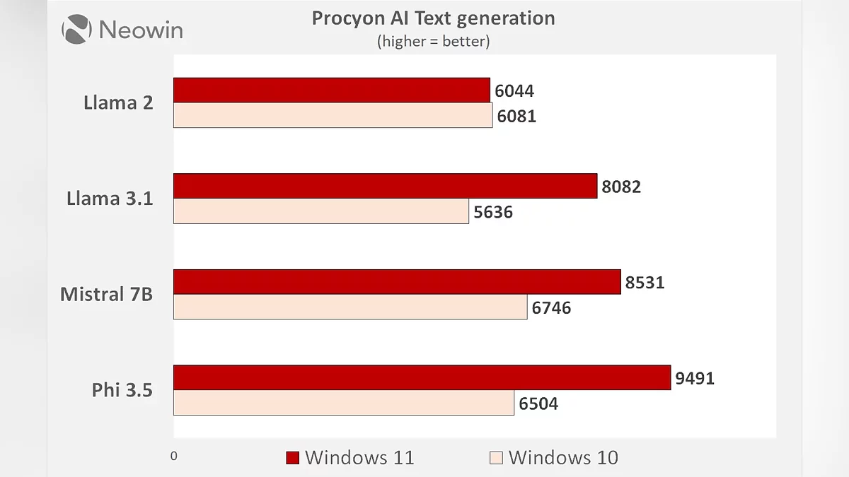В приложениях результаты оказались смешанными. В UL Procyon Office: Windows 10 выиграла в Excel, а Windows 11 — в Outlook и PowerPoint, в свою очередь Word показал ничью. При работе с генерацией текста ИИ (Phi 3.5, Llama 3.1) Windows 11 24H2 оказалась на 43-46% производительнее, что подтверждает ее оптимизацию под современные ИИ-нагрузки.