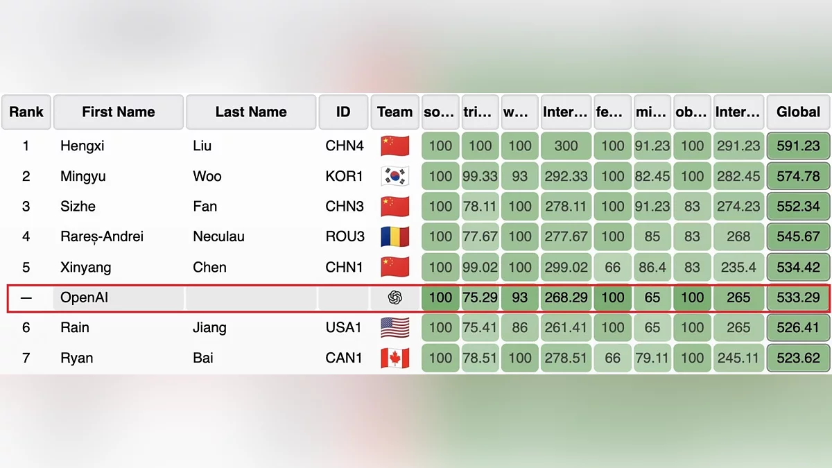 Экспериментальная модель искусственного интеллекта, созданная OpenAI, стала лидером в зачёте среди ИИ-участников Международной олимпиады по информатике (IOI 2025). Разработка набрала 533,29 балла, что соответствует уровню золотой медали. В общем рейтинге всех участников, включая людей, ИИ уступил лишь пяти программистам.