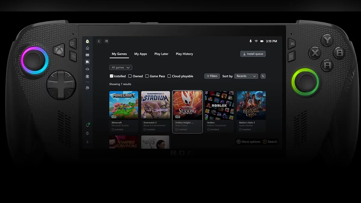 Больше всего ASUS и Microsoft гордятся изменениями, которые они внесли в операционную систему. При включении ROG Xbox Ally пользователь видит не рабочий стол Windows, а обновлённый игровой интерфейс под названием Xbox Experience. При желании, конечно, никто не запрещает перейти в привычный режим работы Windows 11 с ярлыками и панелью задач, однако по умолчанию он спрятан.