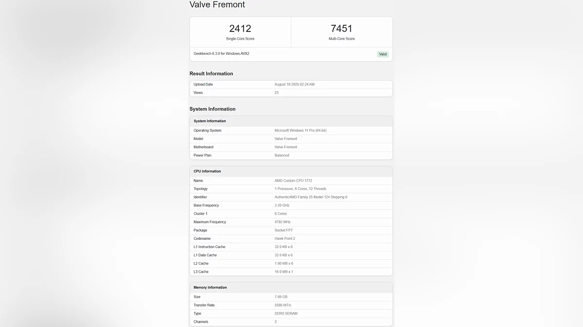 В бенчмарке Geekbench 6 Fremont набирает около 2 412 баллов в однопоточном режиме и 7 451 балл в многопоточном. Это почти вдвое выше, чем у Steam Deck OLED, однако по меркам PC результаты не такие и внушительные. При этом тестовая конфигурация была оснащена всего 8 ГБ оперативной памяти стандарта DDR5, что для конечного продукта кажется маловатым. Скорее всего, в релизной версии устройства, если релиз всё-таки состоится, этот объем будет увеличен.