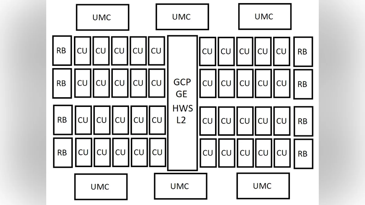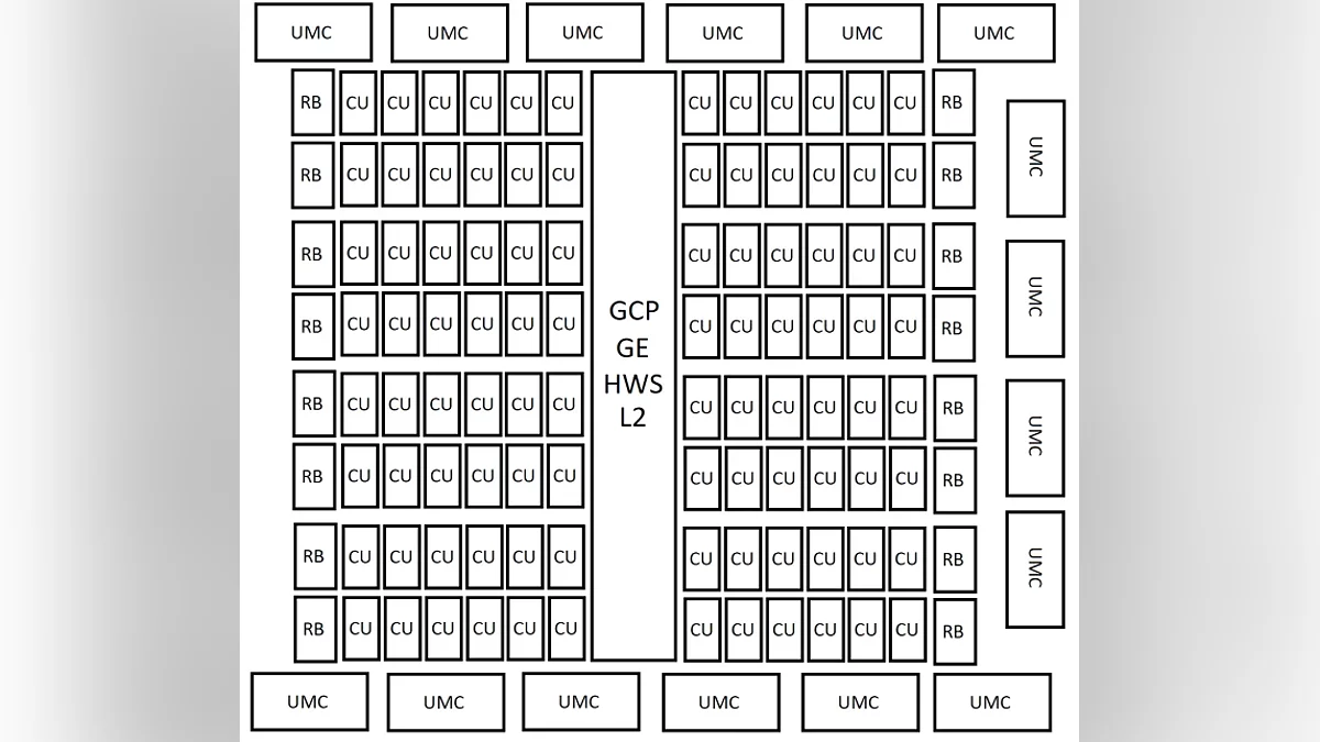 Флагманский чип, условно обозначенный как AT0 (Alpha Trion 0), будет использовать модульную компоновку: 8 шейдерных массивов, каждый из которых содержит два шейдерных движка (Shader Engine) по 6 вычислительных блоков в каждом. Это и формирует итоговые 96 CU. Центральный блок SoC будет объединять командный процессор (GCP), графический движок (GE), аппаратные планировщики (HWS) и кэш второго уровня (L2).