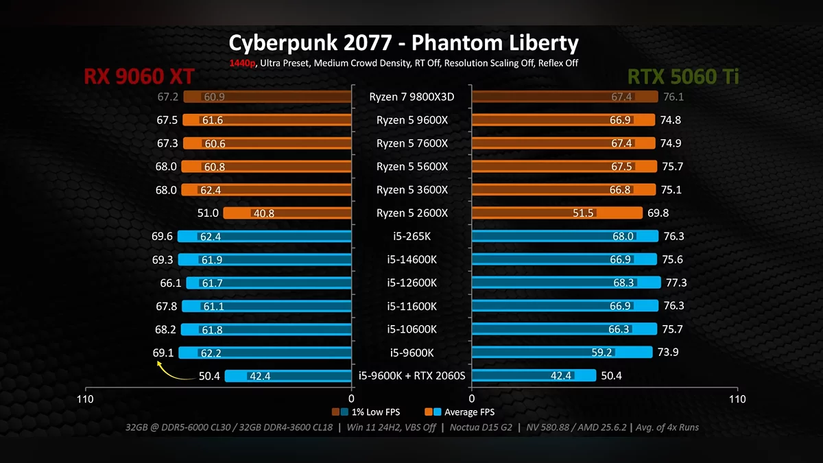 Целью было выяснить, станет ли старый центральный процессор самым слабым местом в сборке для современной видеокарты и можно ли сэкономить, купив только ее, без замены материнской платы, оперативной памяти и самого CPU. Результаты тестирования оказались неоднозначными и сильно зависели от конкретной платформы. Со стороны AMD процессор Ryzen 5 3600X (выпущен в 2019 году) отстал от современного Ryzen 5 9600X в среднем всего на 5–9%, Более заметная разница наблюдалась с Ryzen 5 2600X (2018 г.) и составила уже 16–21%.