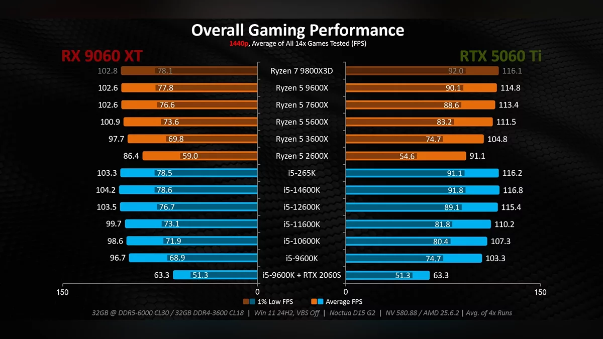Канал Hardware Canucks проверил, насколько оправдан апгрейд только видеокарты при использовании процессоров прошлых поколений. Специалисты взяли две новые модели — AMD Radeon RX 9060 XT и NVIDIA GeForce RTX 5060 Ti с 16 ГБ памяти — и протестировали их в паре с 11 различными процессорами Intel и AMD, выпущенными с 2018 по 2025 год.
