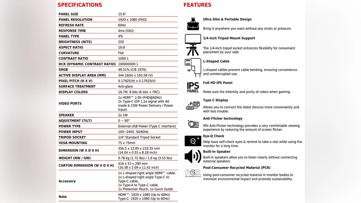 При весе всего 780 грамм и толщине менее 1,4 см монитор легко помещается в рюкзак, также производитель добавил опцию регулировки наклона и стандартное крепление для штатива 1/4 дюйма, что может пригодиться для организации рабочего пространства. Для заботы о зрении пользователя в монитор внедрили фирменную технологию MSI EyesErgo, которая снижает мерцание и снижает уровень синего света. Комплект поставки включает L-образные кабели (HDMI и Type-C), которые не мешают при переноске, и утилиту Display Kit для тонкой настройки изображения.