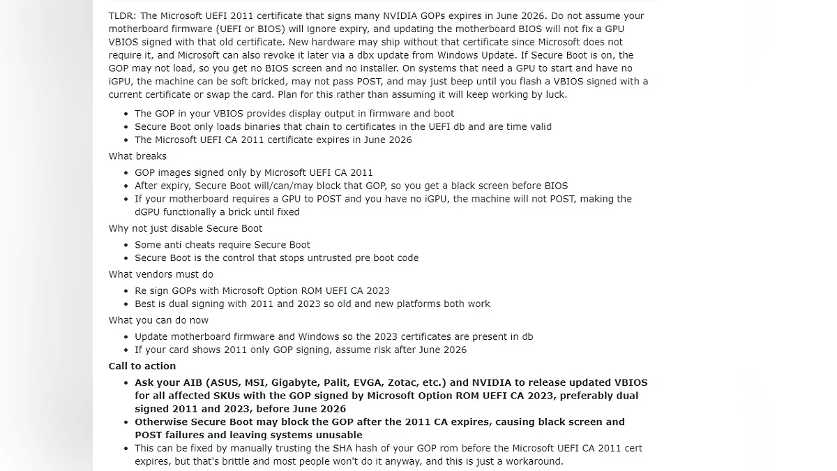 Эксперты советуют владельцам старых видеокарт GeForce уже сейчас начинать мониторить сайты производителей на предмет выхода новых прошивок, а также поддерживать актуальную версию Windows, которая помогает системе распознавать новые доверенные сертификаты.
