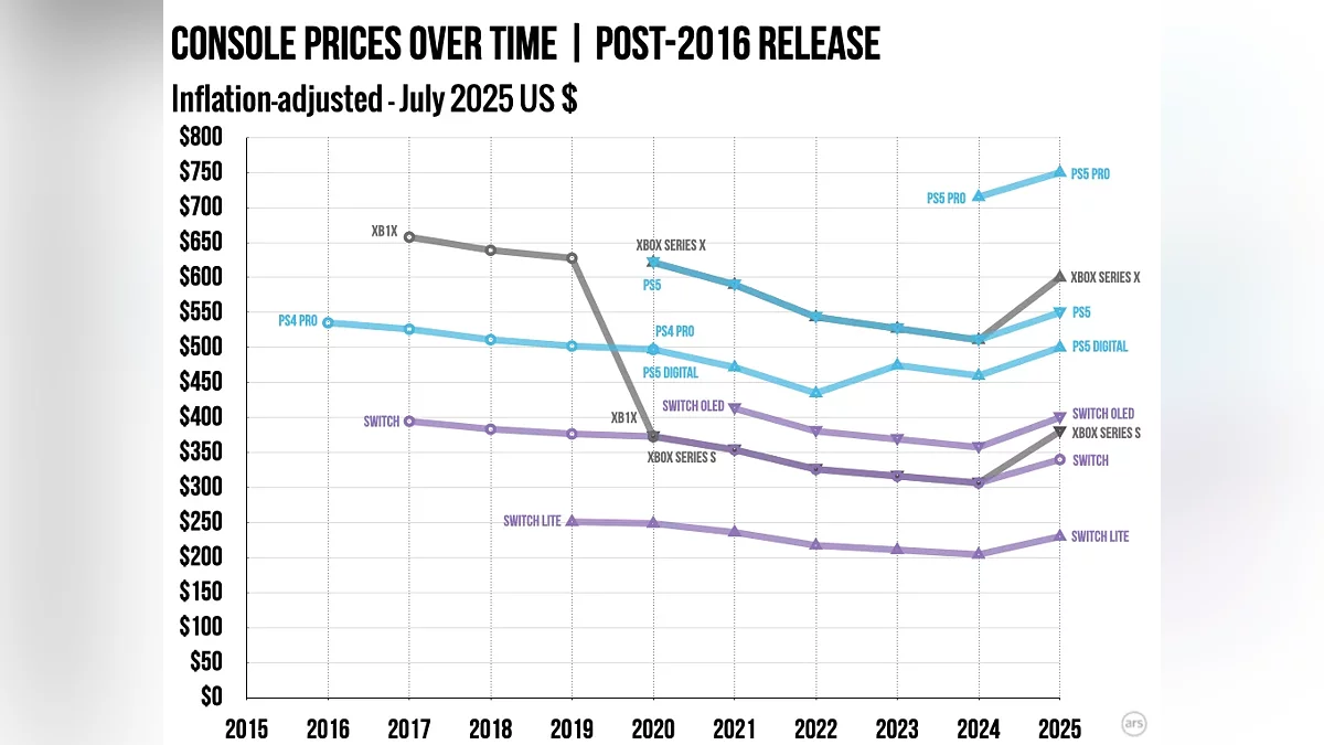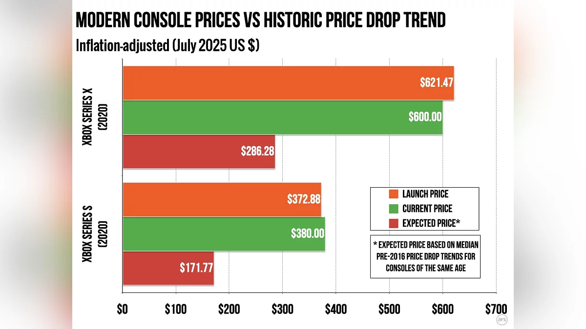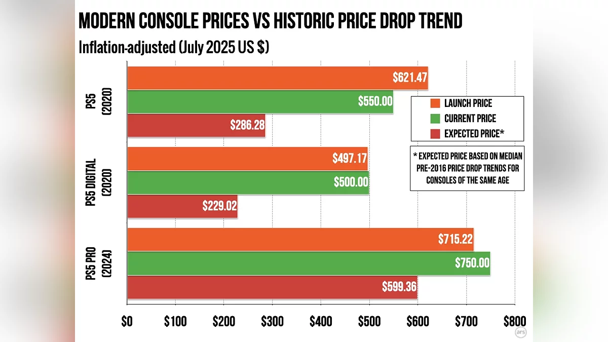 Согласно исследованию, проведенному порталом ArsTechnica, и основанному на анализе ценников десятков консолей начиная с 1977 года, были выявлены некоторые закономерности, которые сейчас перестали действовать. В прошлом медианная стоимость приставок через три года после запуска составляла менее половины от стартовой цены с учетом инфляции, а к пятому году она могла опускаться до 43% от первоначальной стоимости.