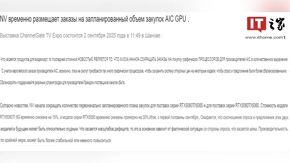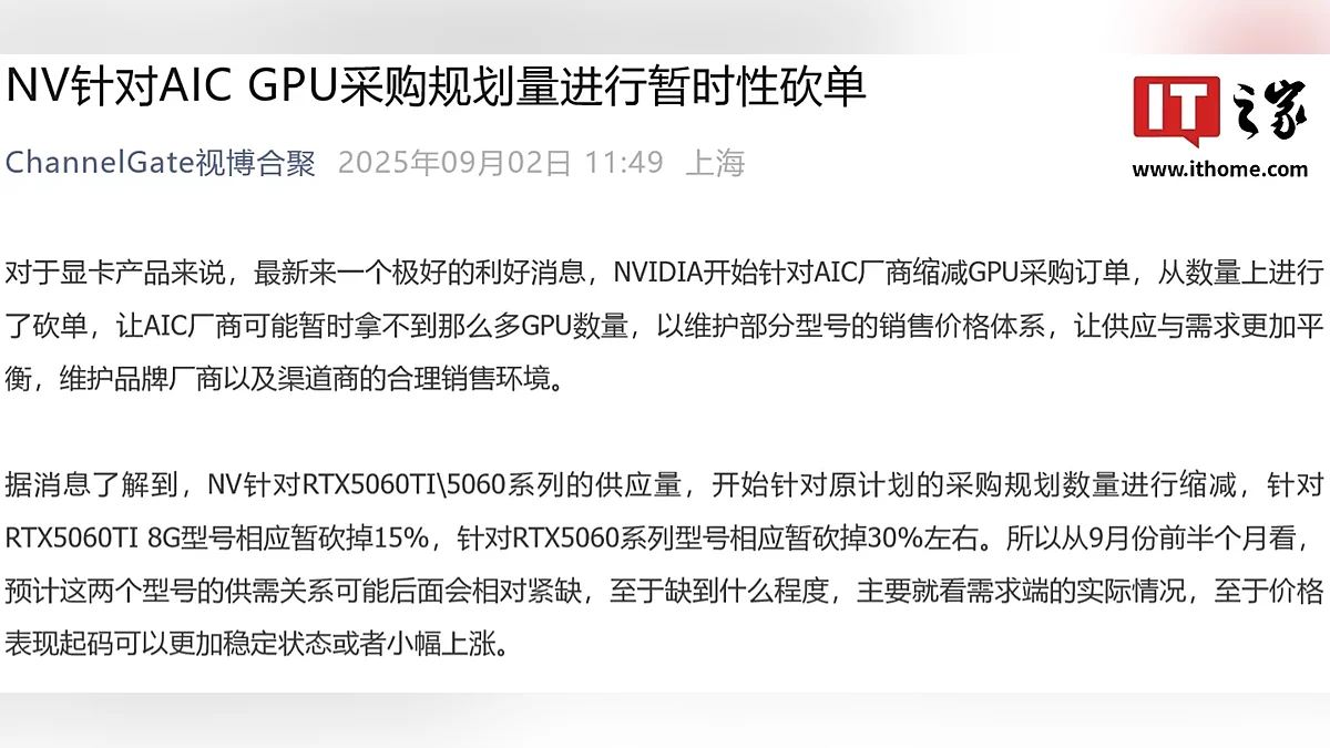 В сети появилась информация о корректировке поставок графических процессоров для видеокарт NVIDIA GeForce RTX 5060 и RTX 5060 Ti. Согласно данным источника из Channel Gate (Bo Ban Tang), NVIDIA приняла решение временно сократить объёмы поставок GPU своим партнёрам-производителям. Сообщается, что объёмы поставок GPU для модели GeForce RTX 5060 Ti с 8 ГБ видеопамяти сокращены на примерно 15%, а младшей модели RTX 5060 на 30%.