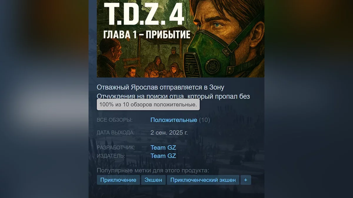 В сервисе Steam состоялся релиз шутера «T.D.Z. 4 Глава 1 — Прибытие» (T.D.Z. 4 Chapter 1 — Arrival), который ранее носил название «T.D.Z. 4 Сердце Припяти» (T.D.Z. 4 Heart of Pripyat).