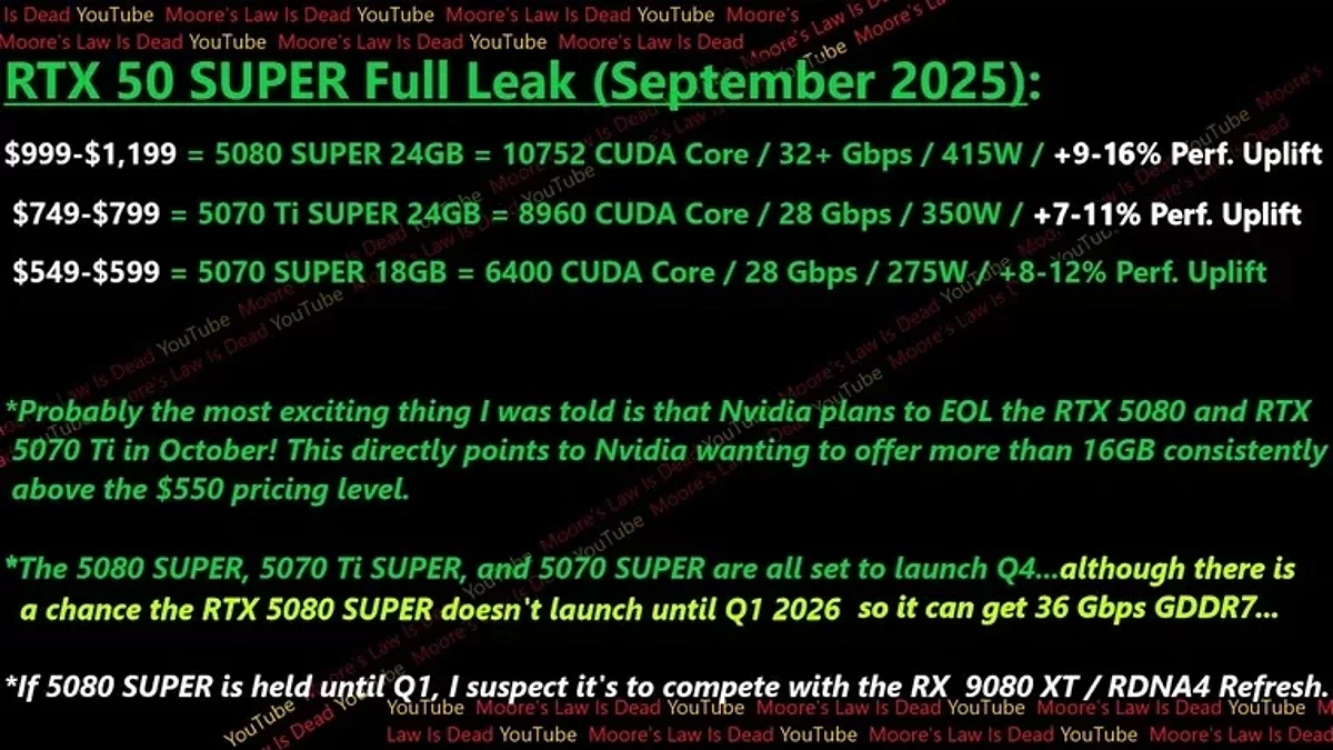 Инсайдер Moore's Law is Dead, сообщает, что в октябре NVIDIA намерена прекратить производство моделей RTX 5080 и RTX 5070 Ti. Это решение связано со скорым анонсом трех новых видеокарт: RTX 5080 SUPER, RTX 5070 Ti SUPER и RTX 5070 SUPER, а их выход на рынок ожидается в четвертом квартале 2025 года.