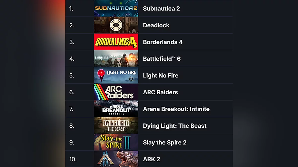 Четвёртое место в топе занимает военный онлайн-шутер Battlefield 6, пятое — песочница Light No Fire от разработчиков No Man's Sky, шестое — extraction-шутер ARC Raiders от бывших разработчиков Battlefield. На седьмой позиции оказался тактический онлайн-шутер Arena Breakout: Infinite, на восьмой — зомби-экшен с открытым миром Dying Light: The Beast, на девятом — рогалик Slay the Spire 2. На последнем месте в первой десятке расположилась выживалка про динозавров ARK 2.