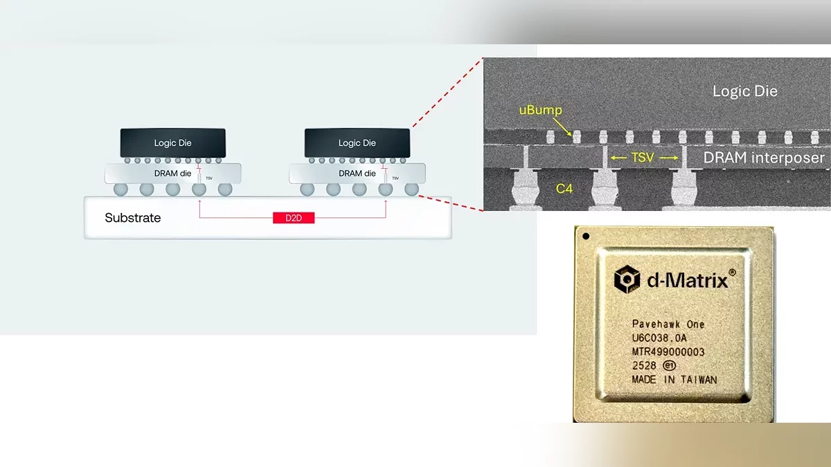 Новый подход компании заключается в принципиально иной компоновке чипов. Технология, получившая название Digital In-Memory Compute (DIMC), предполагает вертикальную сборку (3D-стэкирование). На кристаллы памяти LPDDR5 помещаются специальные вычислительные чиплеты, которые соединены через интерпозер, что позволяет выполнять вычисления прямо внутри массива памяти, значительно сокращая задержки и энергозатраты на перемещение данных.