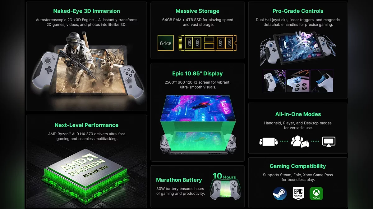 Основой высокой производительности устройства выступил процессор AMD AI9 HX370 со встроенной графикой Radeon 890M, которая рассчитана на современные игры и приложения, а по своей производительности близка к дискретной NVIDIA RTX 4060. Базовая конфигурация включает 64 ГБ оперативной памяти LPDDR5 и слоты для высокоскоростных накопителей NVMe, так что аппаратная платформа демонстрирует отличную мощь для портативного устройства.