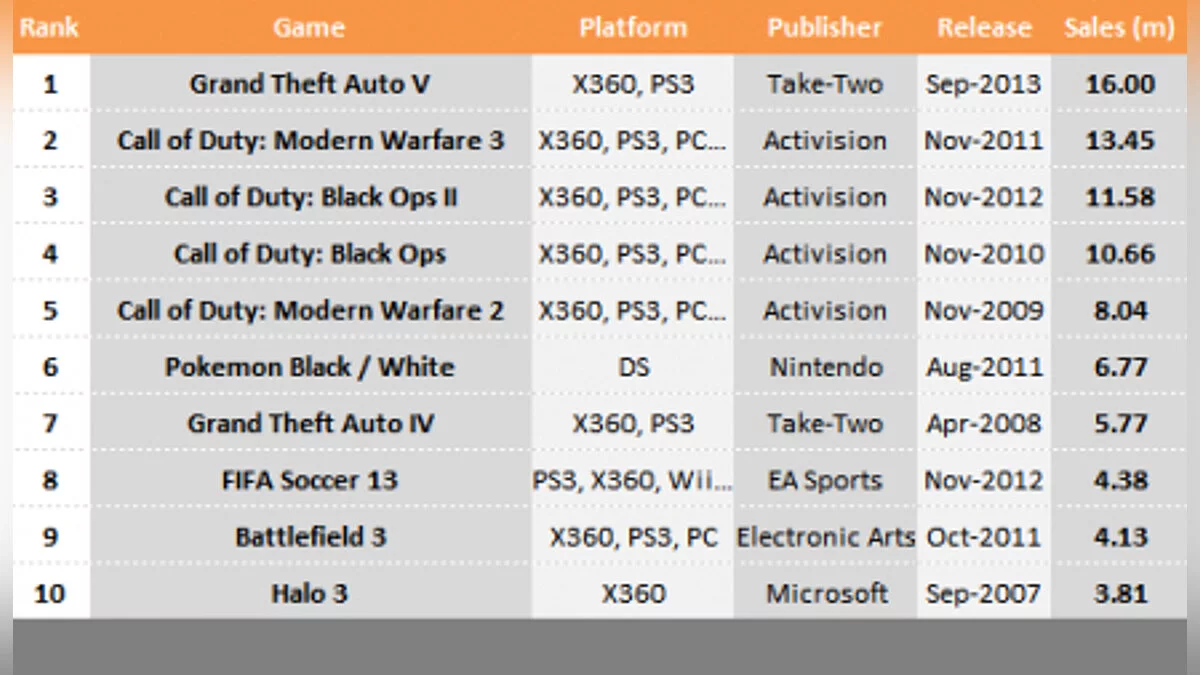Подводя итог, можно сказать, что GTA 5 более чем уверенно обскакала своих конкурентов. Ближайший из них в лице Call of Duty: Modern Warfare 3 на данный момент довольствуется 13,45 млн. проданных копий. Нельзя также не отметить, что она и прочие игры серии Call of Duty вышли на трёх и более платформах, тогда как шедевру Rockstar для столь ошеломляющих показателей хватило всего двух.