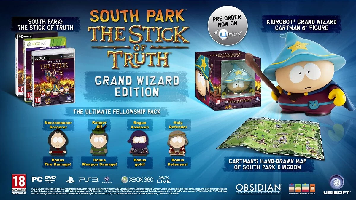 South Park: The Stick of Truth Grand Wizard Edition порадует игроков коллекционной фигуркой Картмана (шикарно!), картой королевства «Южный Парк» и также The Stick of Truth Ultimate Fellowship Pack, коллекцией костюмов со специальными способностями: экипировка некроманта повысит урон от огненных шаров, воры-ассасины получают больше золота, эльфы-рейнджеры лучше дерутся, а святые защитники, ясное дело, обладают бонусом к защите. Стоить данное издание будет 2 400 рублей.