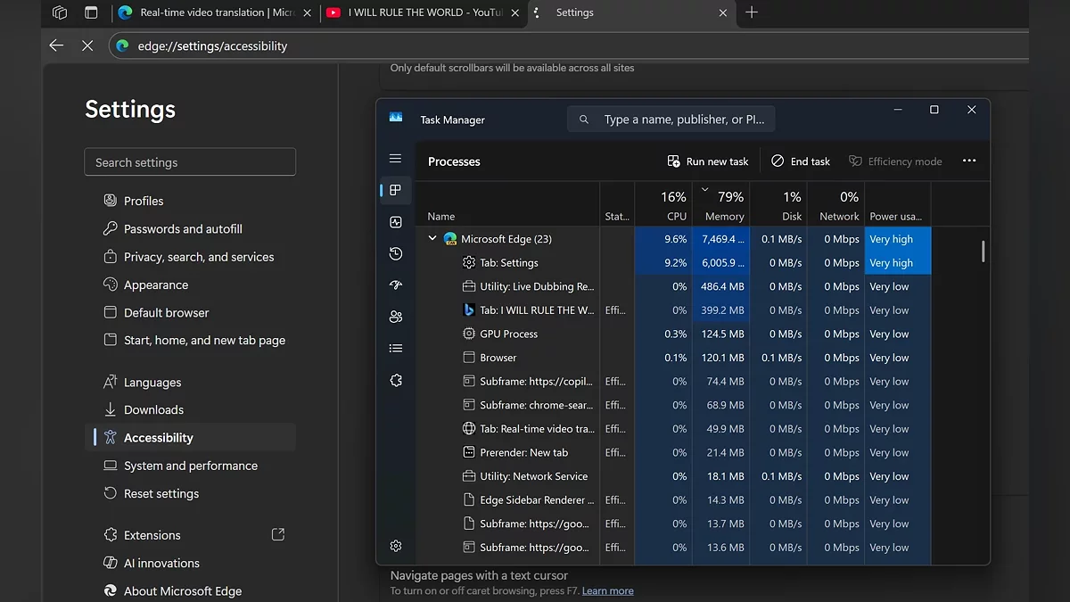 В текущей версии функционал сильно ограничен. Доступны всего три языка для перевода: английский, испанский и корейский и поддержка сайтов также минимальна — функция стабильно работает пока только на YouTube. Главным недостатком оказались высокие аппаратные требования, ведь для работы нейросетевого перевода системе необходимо не менее 12 ГБ оперативной памяти. Подобная прожорливость создает проблемы даже для современных устройств с 16 ГБ ОЗУ, так как сама Windows 11 в фоне использует около 4 ГБ оперативной памяти. Поэтому в моменте воспроизведения видео с функцией перевода, браузер практически полностью занимает всю доступную память, что может мешать работе других приложений.