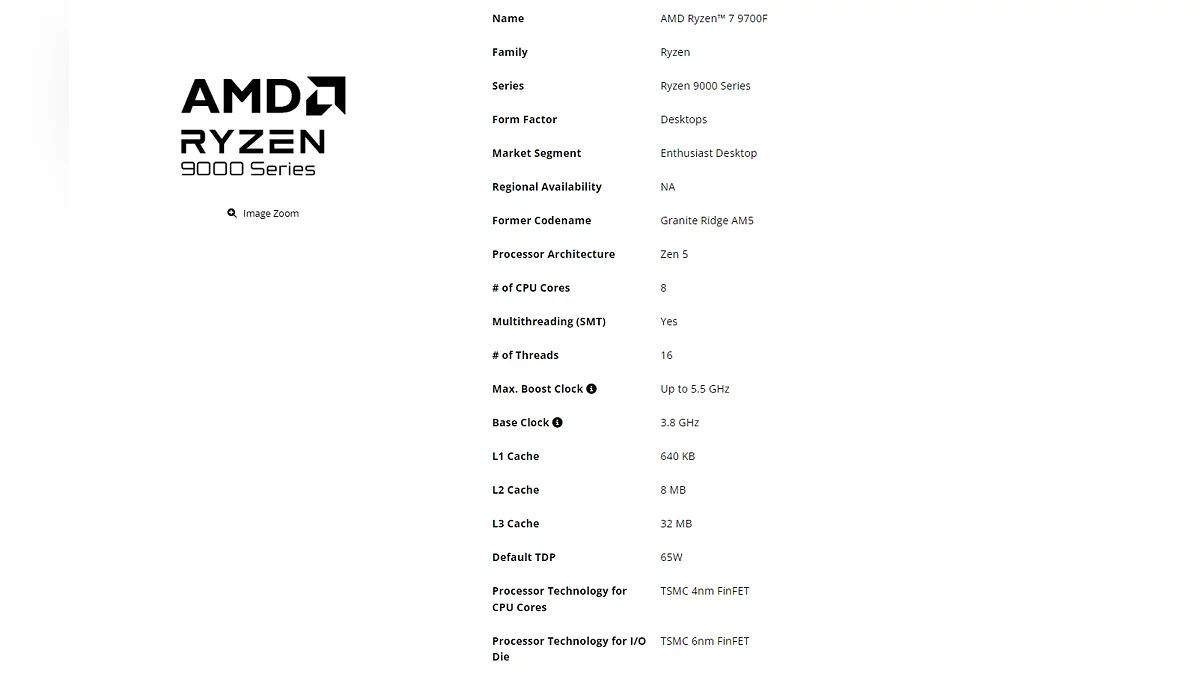Компания AMD продолжает планомерно расширять ассортимент процессоров на новой архитектуре Zen 5. В день официального страта продаж модели Ryzen 5 9500F, на сайте производителя появились официальные спецификации старшей версии процессора — восьмиядерного Ryzen 7 9700F.