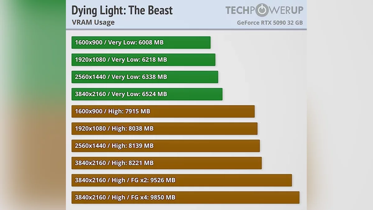 Dying Light: The Beast не потребляет большого объема VRAM, что неудивительно, учитывая низкое качество текстур, которое мы наблюдаем во многих местах. На максимальных настройках и разрешении 4K игра использует около 8 Гб VRAM, а с генерацией кадров — около 10 Гб. Это означает, что видеокарты с 8 Гб VRAM будут хорошо справляться, хотя их видеопамять будет достаточно сильно загружена даже при разрешении 1080p. На самых низких настройках использование VRAM немного превышает 6 Гб, поэтому видеокартам с 6 Гб VRAM или меньше будет сложно обрабатывать игру, или им придется постоянно обмениваться данными между GPU и основной памятью, что серьезно скажется на производительности.