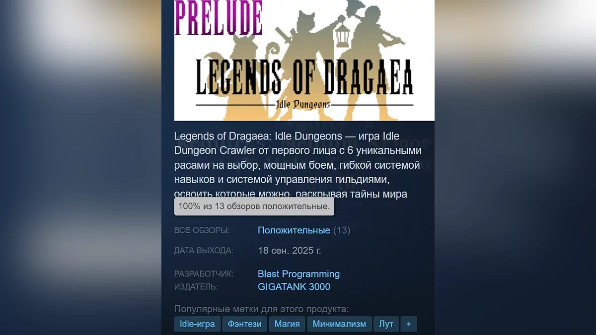 Legends of Dragaea: Idle Dungeons Prelude — игра в жанре Idle Dungeon Crawler, где нужно исследовать мрачные подземелья с опасными монстрами. Является своеобразной демоверсией Legends of Dragaea: Idle Dungeons, которая находится в разработке. Имеет 100% рейтинга. Страница в Steam.