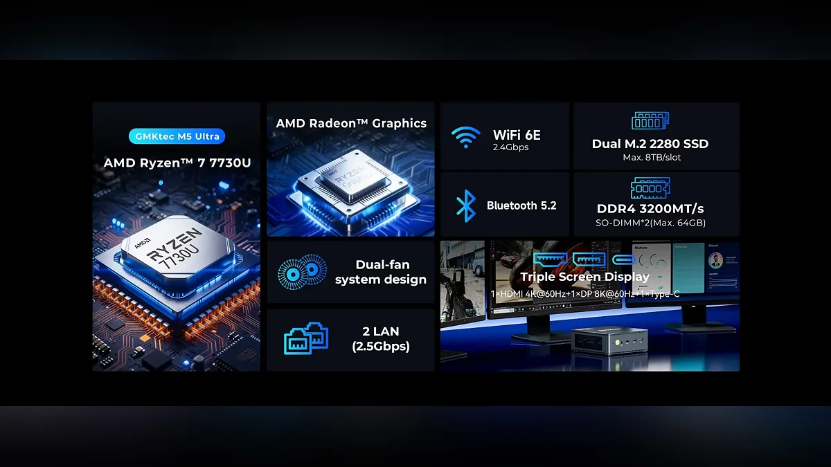 Главной особенностью NucBox M5 Ultra стала поддержка одновременной работы с тремя мониторами, включая дисплеи с разрешением до 8K, что открывает возможности для профессионального использования: монтажа видео, проектирования, работа с графикой на нескольких экранах. В основе устройства — 8-ядерный процессор AMD Ryzen 7 7730U, который дополнительно адаптирован под три режима энергопотребления, позволяющие выбрать баланс между тишиной работы и производительностью. Для охлаждения внутренностей мини-PC используется система с двумя вентиляторами.