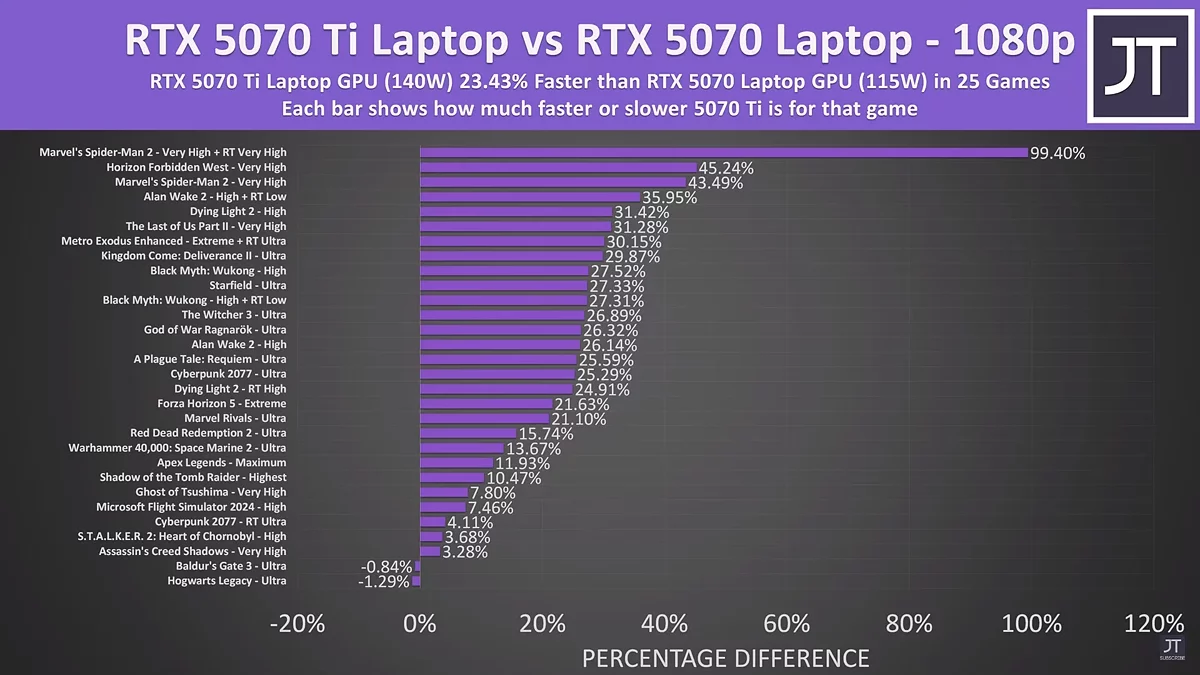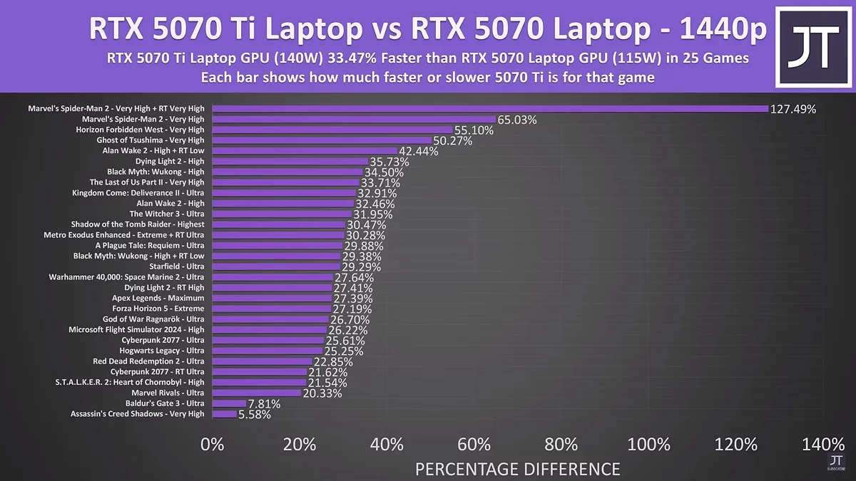 Мобильная RTX 5070 Ti превосходит RTX 5070 на 127% в требовательных играх