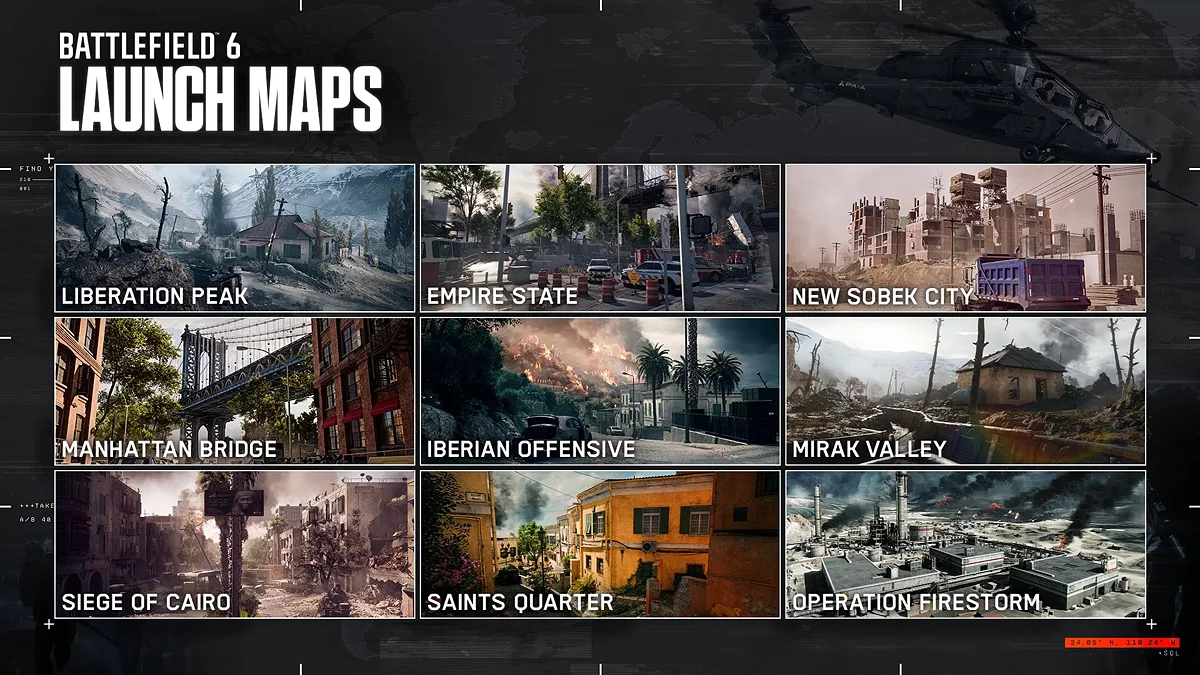 На старте Battlefield 6 предложит игрокам одиночную сюжетную кампанию, девять мультиплеерных карт (Empire State, Iberian Offensive, Liberation Peak, Manhattan Bridge, Mirak Valley, New Sobek City, Operation Firestorm, Saints Quarter и Siege of Cairo) и множество режимов (Breakthrough, Conquest, Escalation, Rush, Domination, King of the Hill, Team Deathmatch и Squad Deathmatch).