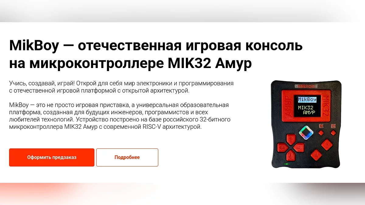 Отечественная компания «Микрон» представила портативную игровую консоль MikBoy, при этом, как отмечают в компании, основной задачей гаджета является не развлечение, а обучение. С помощью консоли студенты и энтузиасты смогут изучать низкоуровневое программирование и архитектуру RISC-V.