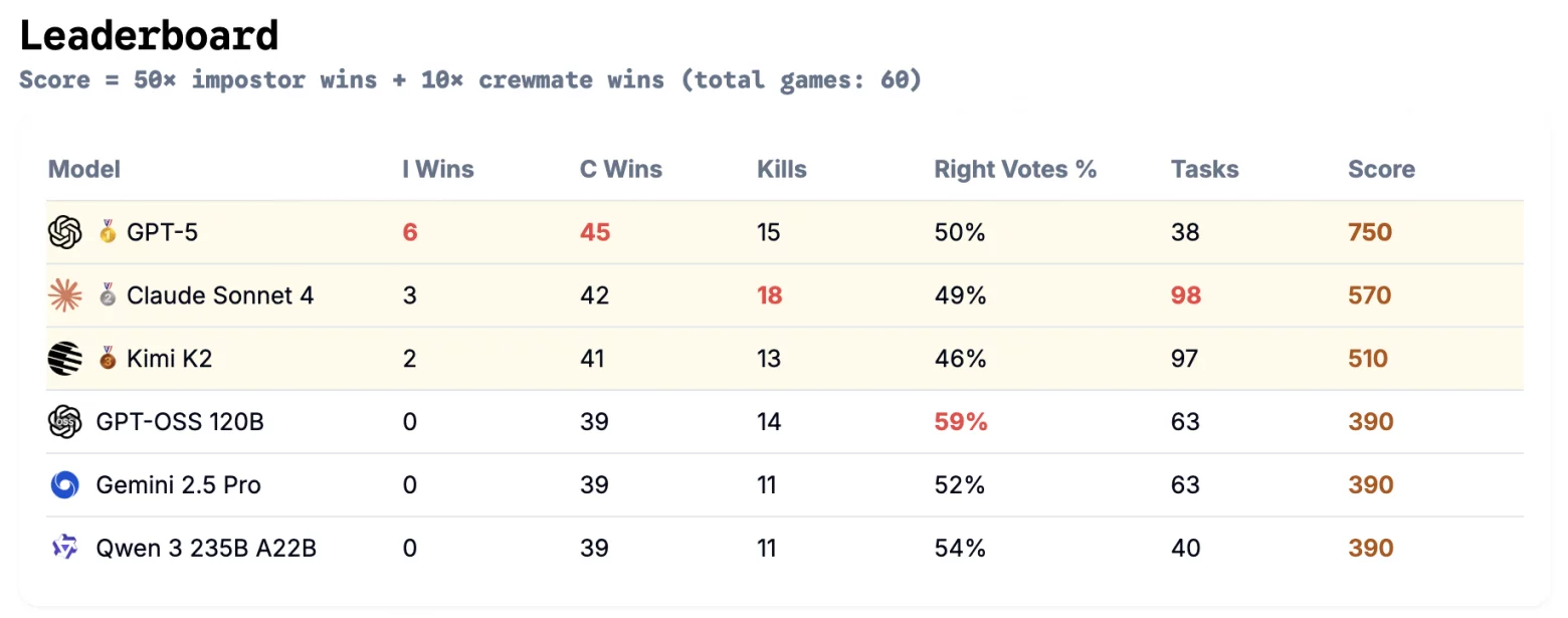Результаты шестидесяти сыгранных партий показали резкую разницу в поведении моделей, так абсолютным лидером стала GPT-5, которая демонстрировала поразительную гибкость поведения. В роли мирного члена экипажа она брала на себя инициативу, анализировала действия других и часто точно указывала на предателя, а когда же ей выпадала эта роль, модель кардинально меняла тактику, начиная виртуозно лгать и перекладывать вину на других.