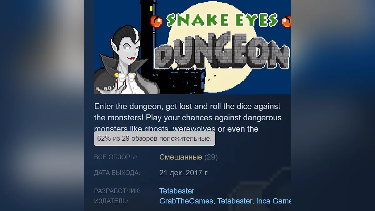 В сервисе Steam стартовала бесплатная раздача рогалика Snake Eyes Dungeon, который до акции стоил 200 рублей (5 долларов). Забрать игру в свою библиотеку можно до 3 октября 20:00 (МСК).