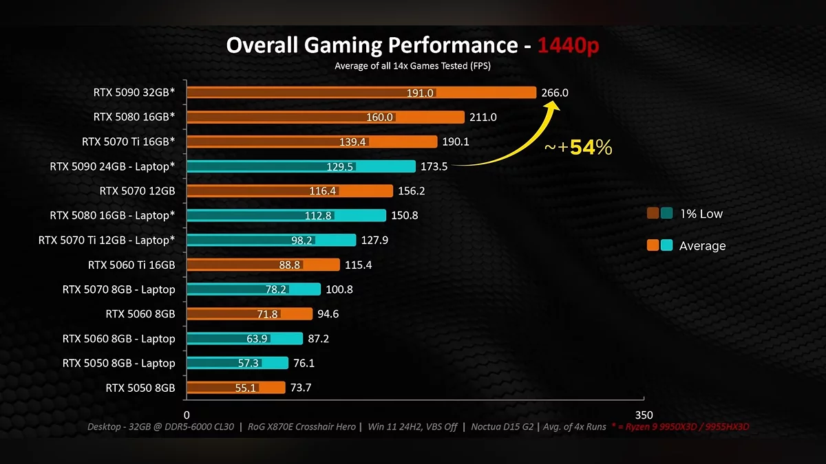 Самые интересные открытия ждали тестеров в начальном сегменте. Оказалось, что ноутбучные RTX 5060 и RTX 5050 не просто догоняют, но в ряде игр, таких как Black Myth: Wukong и Horizon Forbidden West, показывают стабильно схожий, а иногда и чуть более высокий результат, чем их настольные аналоги. Данный феномен объясняется тем, что младшие мобильные чипы имеют незначительно урезанное количество вычислительных ядер, но при этом способны работать на более высоких частотах, компенсируя разницу. В случае с RTX 5050 ноутбучная версия даже получила более современную память GDDR7, что дало ей преимущество в пропускной способности.