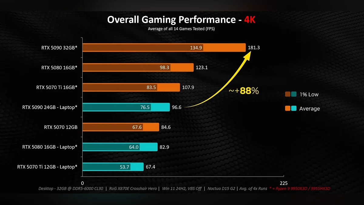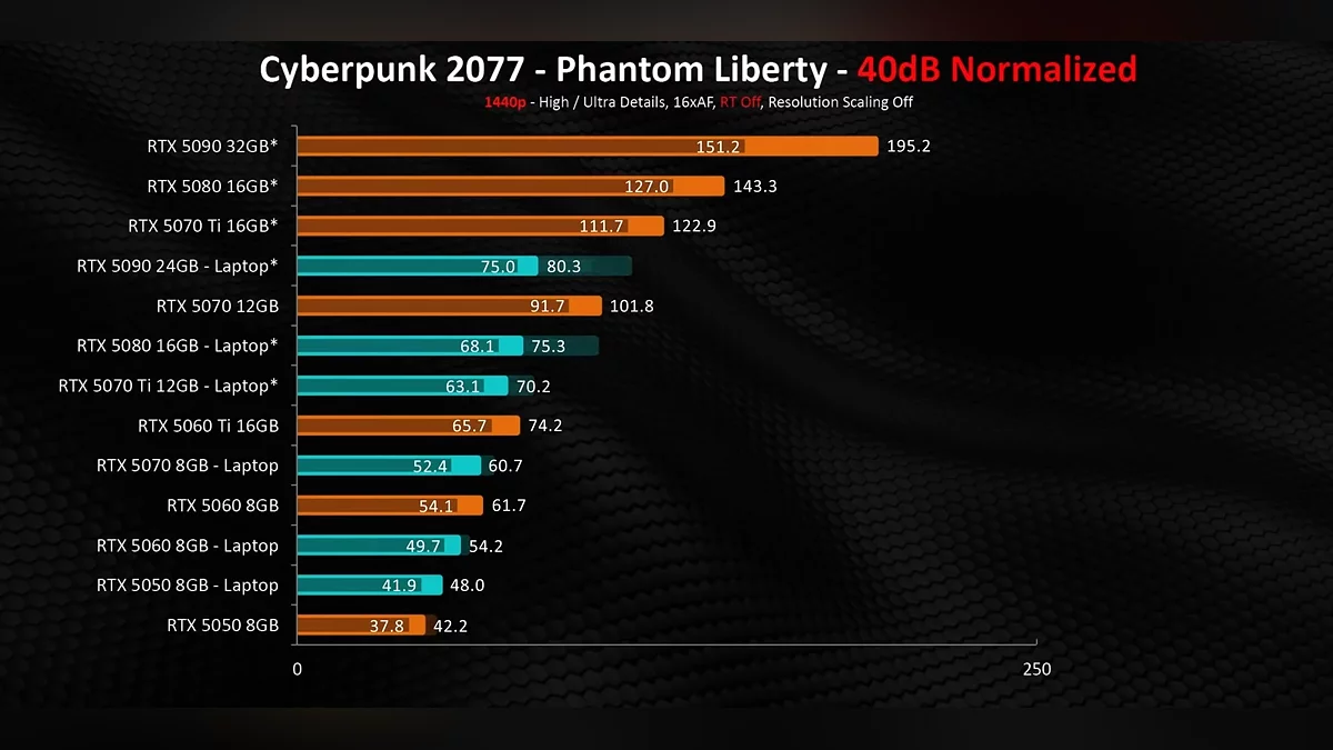 Мобильная RTX 5090, топовый вариант для ноутбуков, в играх часто не может догнать даже настольную RTX 5070 Ti. В некоторых сценариях, например в Alan Wake 2, разница между ноутбучными RTX 5090 и RTX 5080 составляет всего 10 кадров в секунду, что ставит под вопрос целесообразности переплаты за флагман, а при переходе на разрешение 4K ситуация усугубляется: десктопная RTX 5090 может быть быстрее своей мобильной тезки почти в два раза. Чтобы раскрыть потенциал RTX 5090 в ноутбуке, система должна работать на максимальных оборотах, что сопровождается высоким уровнем шума. При снижении шума до комфортных 40 дБ производительность флагманских моделей падает до уровня настольной RTX 5060 Ti.
