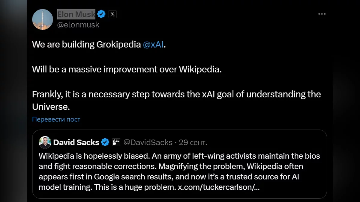 Поводом для заявления стал публичный диалог в социальной сети X между Маском и инвестором Дэвидом Саксом (David O. Sacks), который высказал критику в адрес Wikipedia, указав на её предвзятость и частое изменение статей. Маск, согласившись с ним, отметил, что проблема усугубляется тем, что именно материалы этой энциклопедии часто используются для обучения крупных языковых моделей (ИИ).