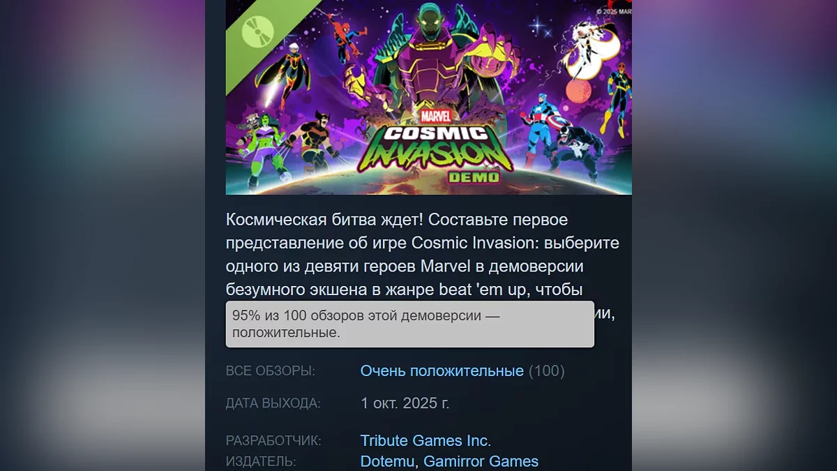1 сентября в Steam вышла бесплатная демоверсия супергеройского битемапа Marvel Cosmic Invasion. Игроки остались довольны демкой — она получила 95% положительных отзывов.