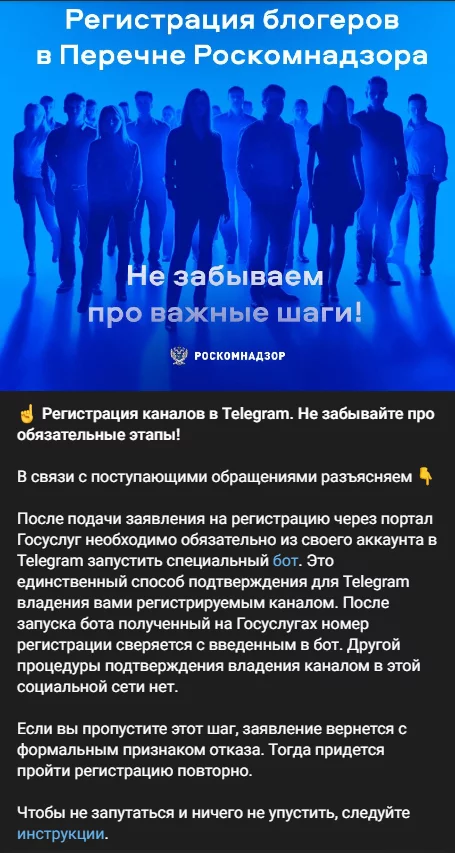 Согласно последним разъяснениям, просто указать данные в описании канала теперь недостаточно и единственным способом подтвердить свой ресурс для Роскомнадзора стала процедура с использованием специального бота. После стандартной регистрации на портале «Госуслуги», владельцу канала необходимо через свой аккаунт в Telegram запустить этого бота и предоставить ему полномочия администратора.