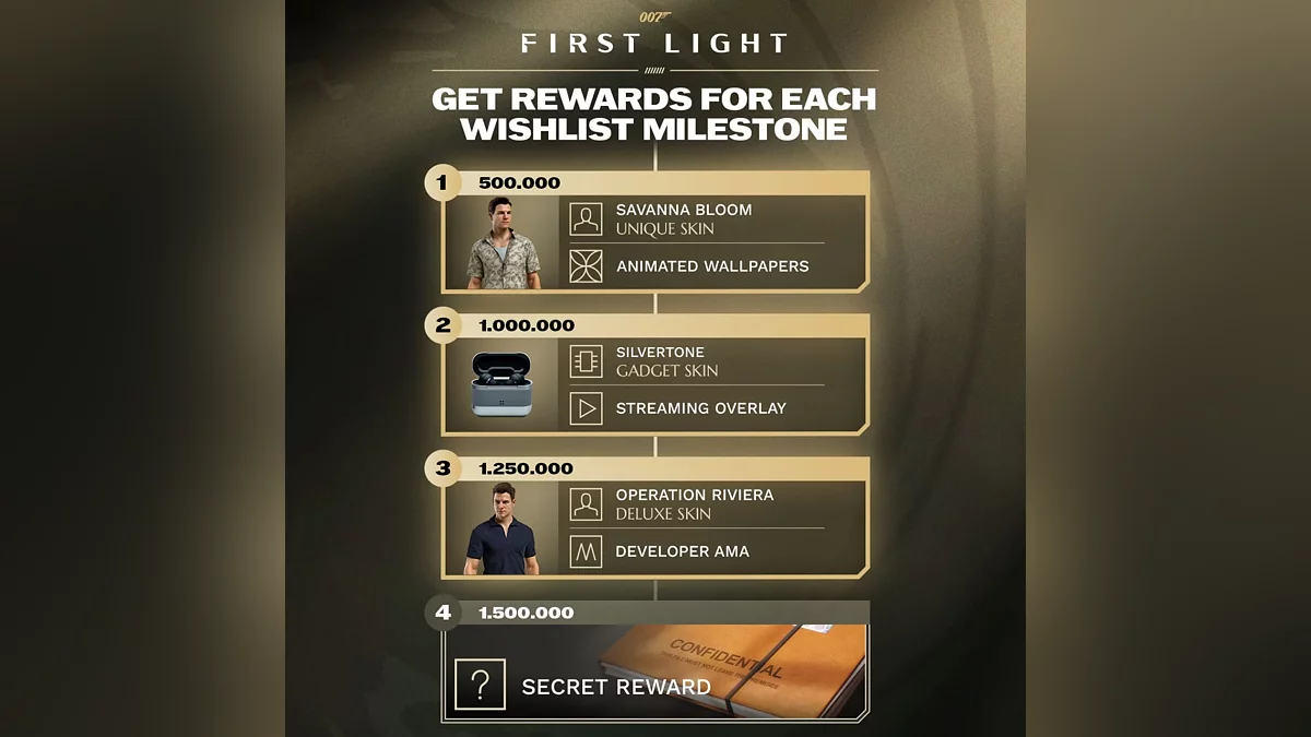 Бесплатный скин называется Operation Riviera. Если 007 First Light добавят в список желаемого ещё 250 тысяч человек, то игроков ждёт некая секретная награда. Подробности пока не раскрываются.