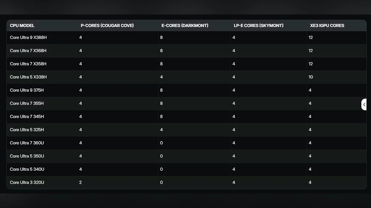 Флагманскими моделями, судя по всему, станут 16-ядерные процессоры, при этом ключевое различие между сериями кроется во встроенной графике. Старшие «Х»-версии, как ожидается, получат до 12 вычислительных блоков графики нового поколения Xe3 и только Core Ultra 5 X338H, окажется немного скромнее и будет располагать 10 такими блоками.