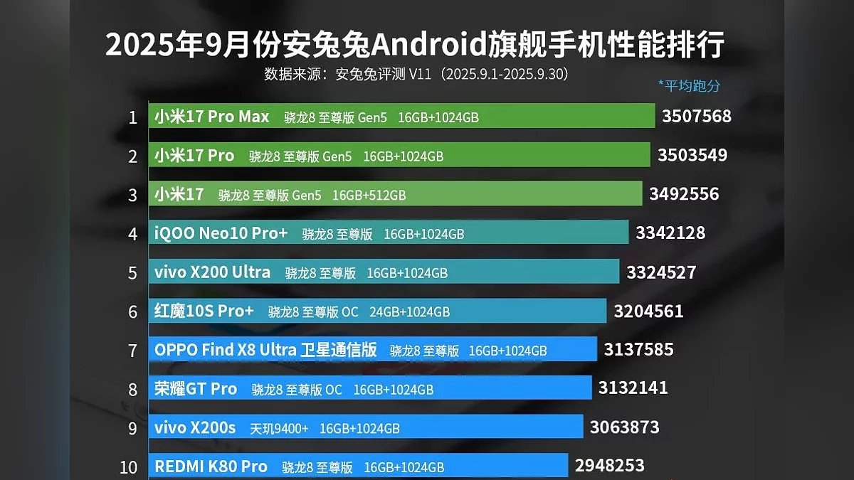 Тройку лидеров среди смартфонов на Android заняли модели Xiaomi 17 Pro Max, Xiaomi 17 Pro и стандартная Xiaomi 17, при этом все устройства работают на новом процессоре Snapdragon 8 Elite Gen 5. Примечательно, что разница в средних баллах между тремя устройствами оказалась незначительной, а это позволяет предположить, что базовая производительность чипа реализована в каждой из моделей на высоком уровне, а небольшое преимущество старшей версии может быть связано с лучшей системой охлаждения.