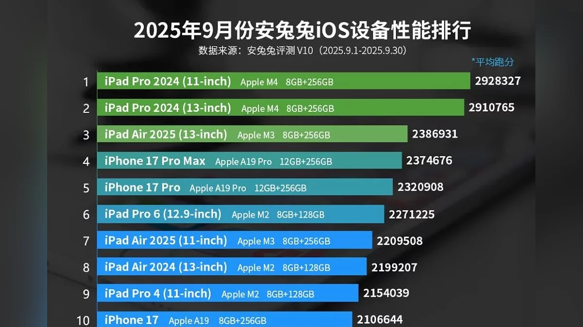 Помимо флагманов Xiaomi, в первую десятку рейтинга вошли смартфоны от iQOO, Vivo и других брендов, также использующие самые современные мобильные платформы. Что касается устройств Apple, то наивысшие результаты в своей категории показали планшеты iPad на чипах M4 и M3. Флагманский iPhone 17 Pro Max расположился следом, что является типичной ситуацией, учитывая разницу в энергопотреблении и охлаждении между смартфонами и планшета.