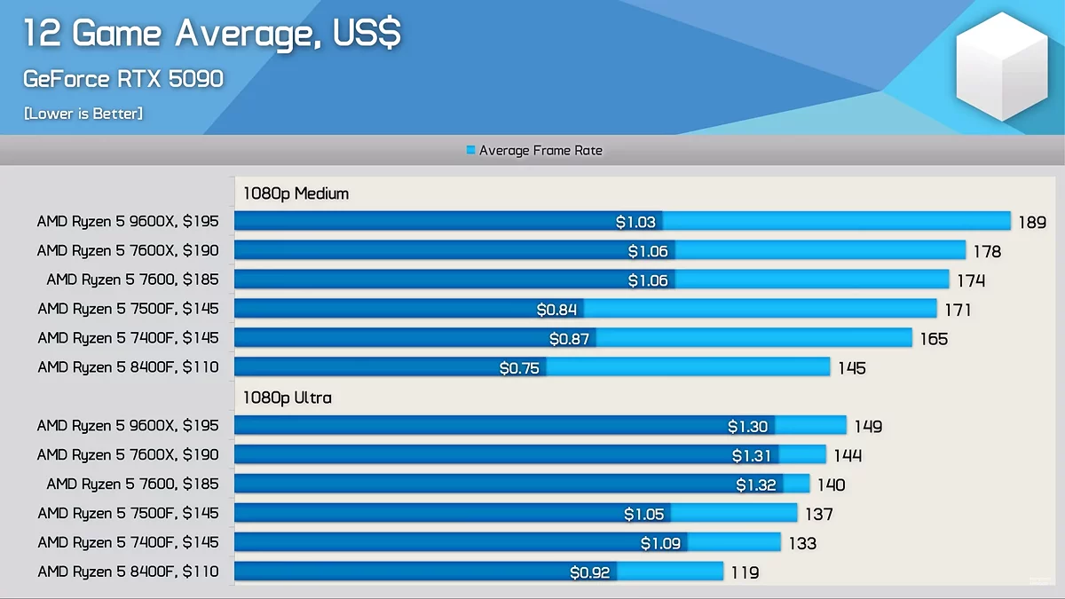 Однако небольшая доплата до 7400F или 7500F выглядит более разумным вложением, ведь эти процессоры предлагают полноценную производительность и более широкие возможности. Таким образом, для геймеров, выбирающих процессор сегодня, наиболее сбалансированными вариантами выглядят модели 7400F и 7500F. Новичок 9600X, хоть и быстрее, но не демонстрирует столь же значительного прироста в соотношении «цена/качество».