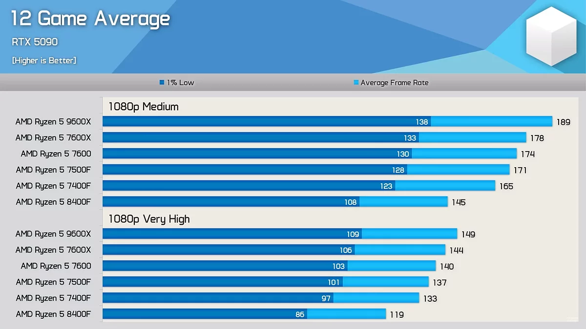 Результаты оказались неоднозначными. Как и ожидалось, новинка — Ryzen 5 9600X — показала наивысшую частоту кадров, отрыв от предыдущего поколения, 7600X, в среднем составил от 3% до 6% в зависимости от игры и настроек, но это не говорит о каком-то весомом скачке производительности, а третье место уверенно заняла модель 7600, лишь немного уступившая версии с индексом Х.