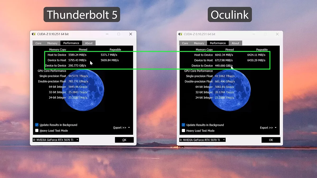 Тесты наглядно продемонстрировали разницу в пропускной способности, где соединение через OCuLink обеспечивало скорость обмена данными на уровне около 6.6 ГБ/с, в то время как Thunderbolt 5 показывал примерно 5.7 ГБ/с, что, на первый взгляд, не огромная разница, но напрямую повлияло на результаты в играх.