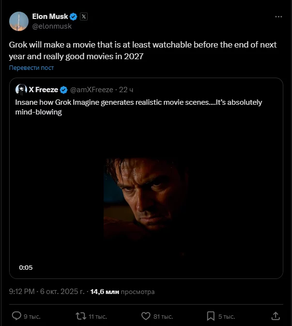 Согласно дорожной карте развития нейросети, уже к концу 2026 года ИИ должен генерировать короткие, но качественные видео продолжительностью до 30 минут, что станет промежуточным этапом перед созданием полнометражных фильмов, которые по своему качеству смогут конкурировать с продукцией голливудских студий. Первый полнометражный фильм от ИИ, по заверению Маска, должен появиться на экранах уже в 2027 году.