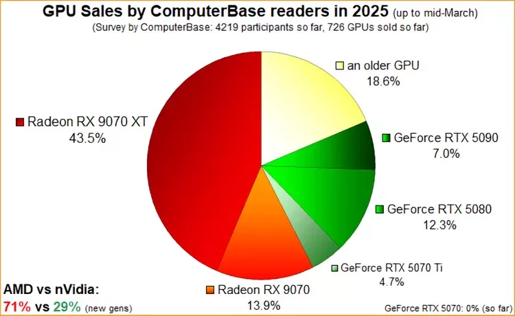 Успех продукции AMD подтверждается и на других площадках, так в крупном американском интернет-магазине Newegg видеокарта Radeon RX 9060 XT недавно возглавляла список самых продаваемых GPU, а в первой пятерке моделей можно было обнаружить сразу несколько решений от AMD на архитектуре RDNA 4, в то время как актуальные новинки NVIDIA располагались чуть ниже. Большой популярностью видеокарты AMD пользуются в Германии и некоторых странах Азии, однако общий рынок по прежнему за NVIDIA.