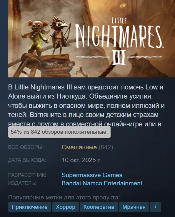 Хоррор Little Nightmares 3 не смог впечатлить игроков — проект получил 54% положительных отзывов в Steam. Критики тоже прохладно приняли новинку (74/100 баллов на OpenCritic).