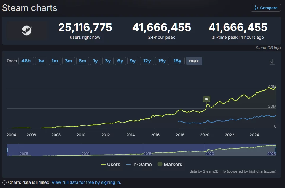 Valve может открывать шампанское: Steam в очередной раз поставил рекорд по пиковому онлайну. Согласно данным SteamDB, вечером 12 октября в сервисе находилось 41,666,455 человек.