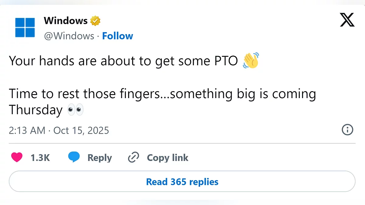 В четверг Microsoft представит масштабное обновление для своей операционной системы. Официальный аккаунт Windows в социальной сети X разместил загадочное сообщение, намекающее на скорый отдых для клавиатур и мышей. «Вашим пальцам пора на перекур. В четверг ждите нечто большое», — гласит публикация. Хотя компания не раскрывает деталей, последние заявления её топ-менеджеров позволяют предположить, в каком направлении движется разработчик.