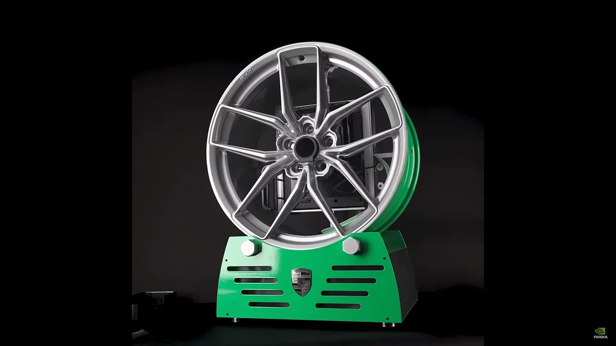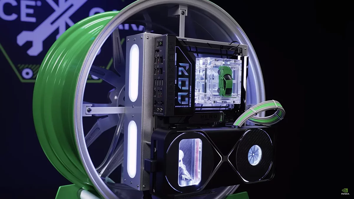 NVIDIA совместно с моддером JCustom, представила необычный проект, результатом их коллаборации стал полноценный игровой компьютер, встроенный в колесо от спорткара Porsche 911 Turbo S. Основой для сборки послужил легкосплавный диск HRE FF21, при этом задача разместить мощные компоненты в ограниченном пространстве колеса оказалась нетривиальной. Для её решения была разработана специальную платформу для материнской платы, которая крепится непосредственно к ободу, создавая иллюзию, что «начинка» парит в воздухе за спицами.