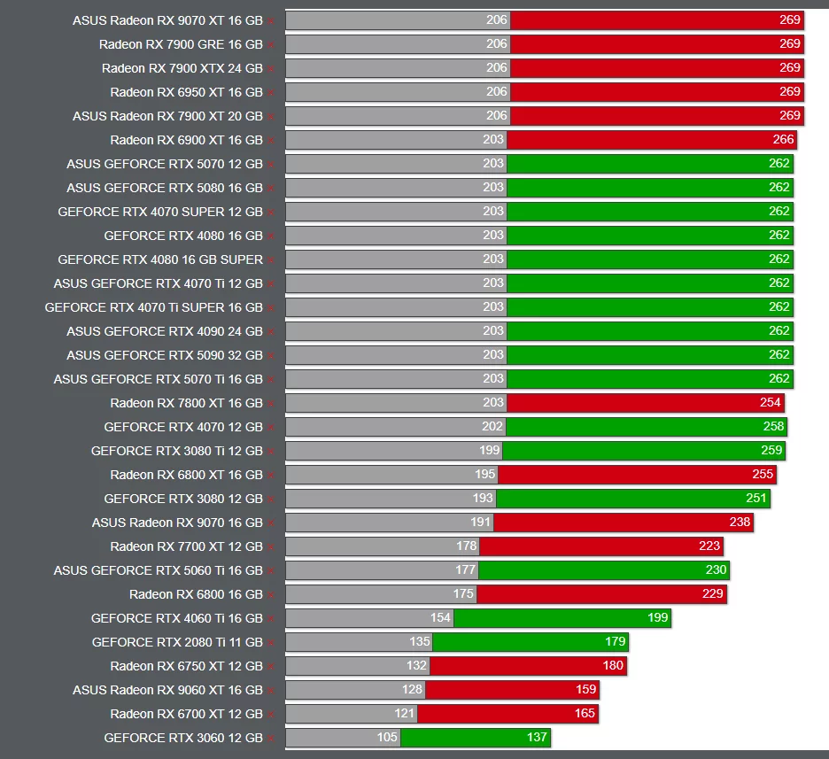 - Radeon RX 9070 XT (16 Гб) — 269 FPS;